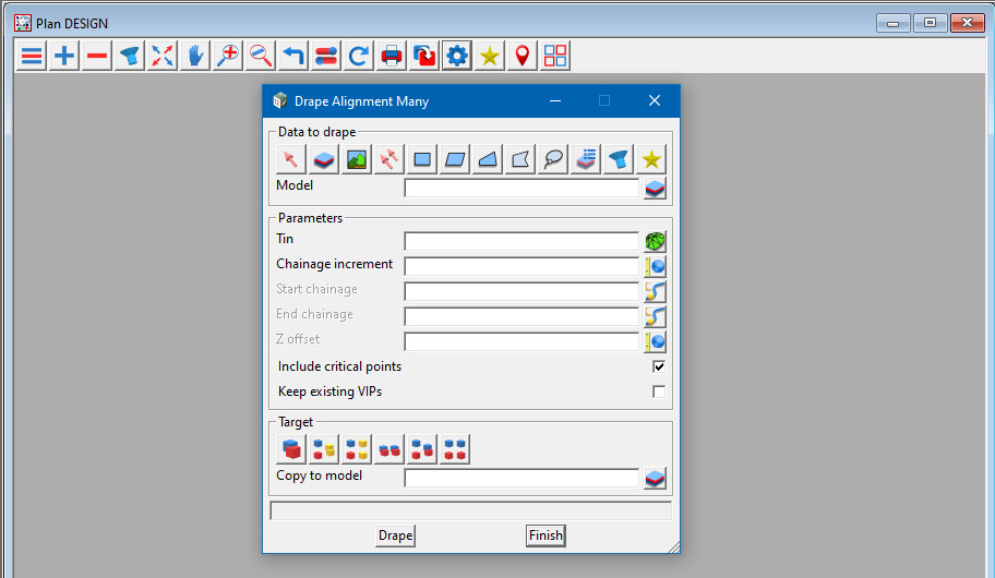 The Drape Alignment operation takes an Alignment/Super Alignment string and creates a new Alignment/Super Alignment string with identical horizontal geometry and the z-value for vertical intersection points taken from a tin. The z-values (IP Method) are taken over a user specified chainage interval and chainage increment. Vertical intersection points outside the chainage range can be kept.