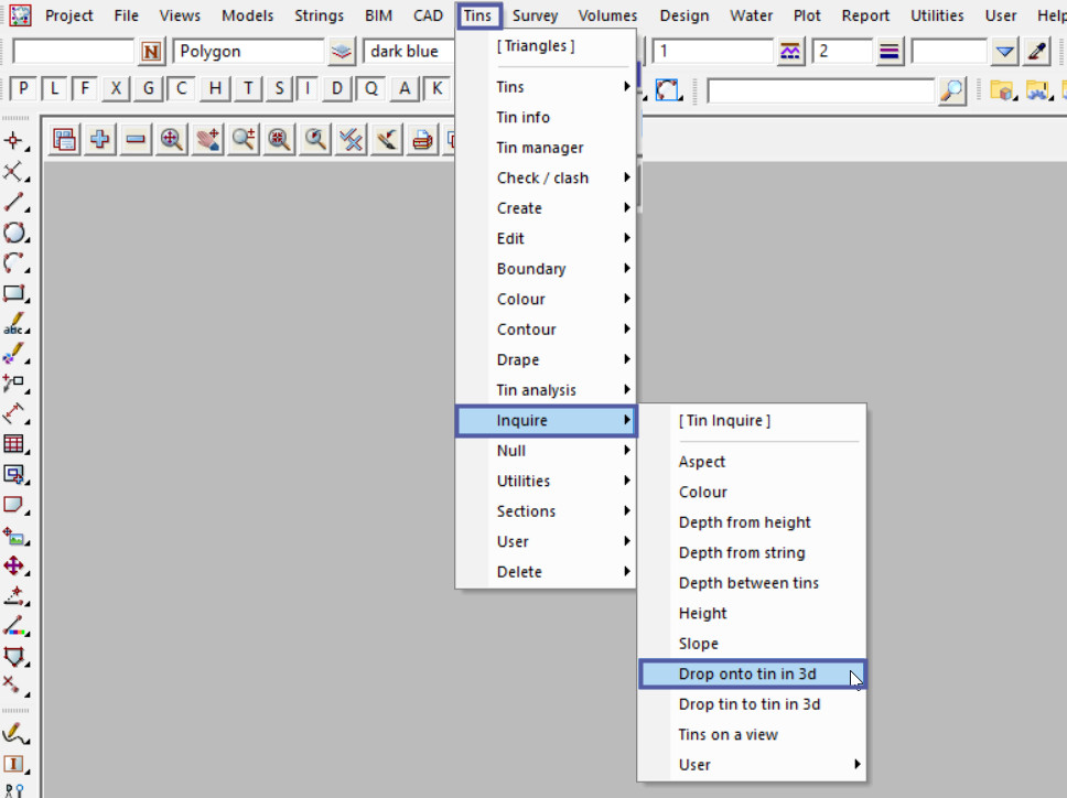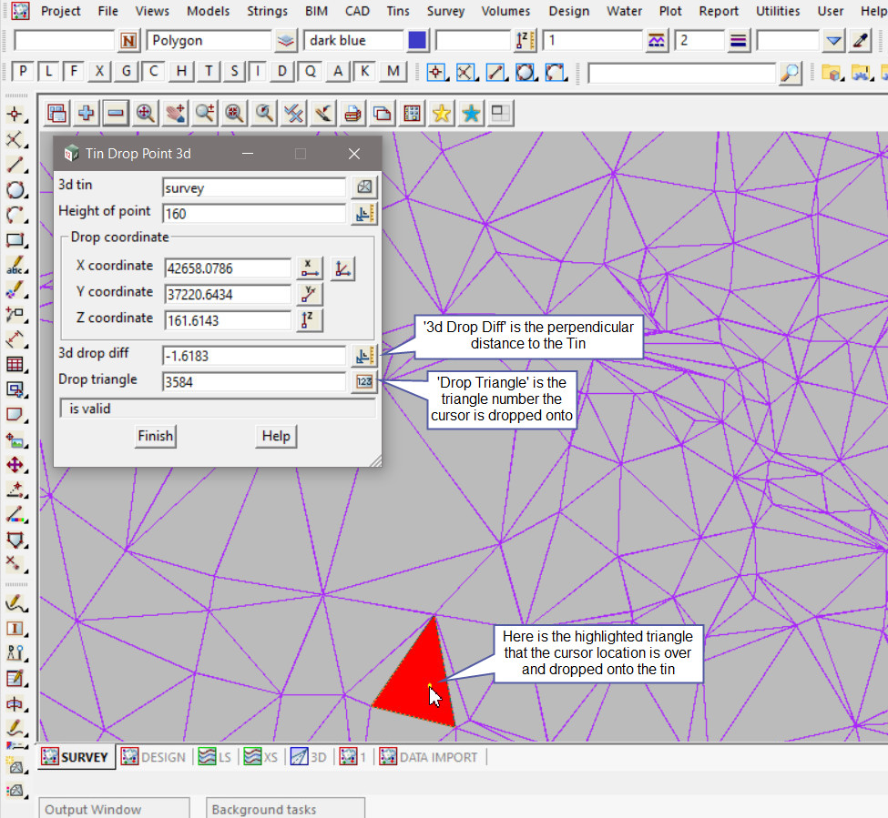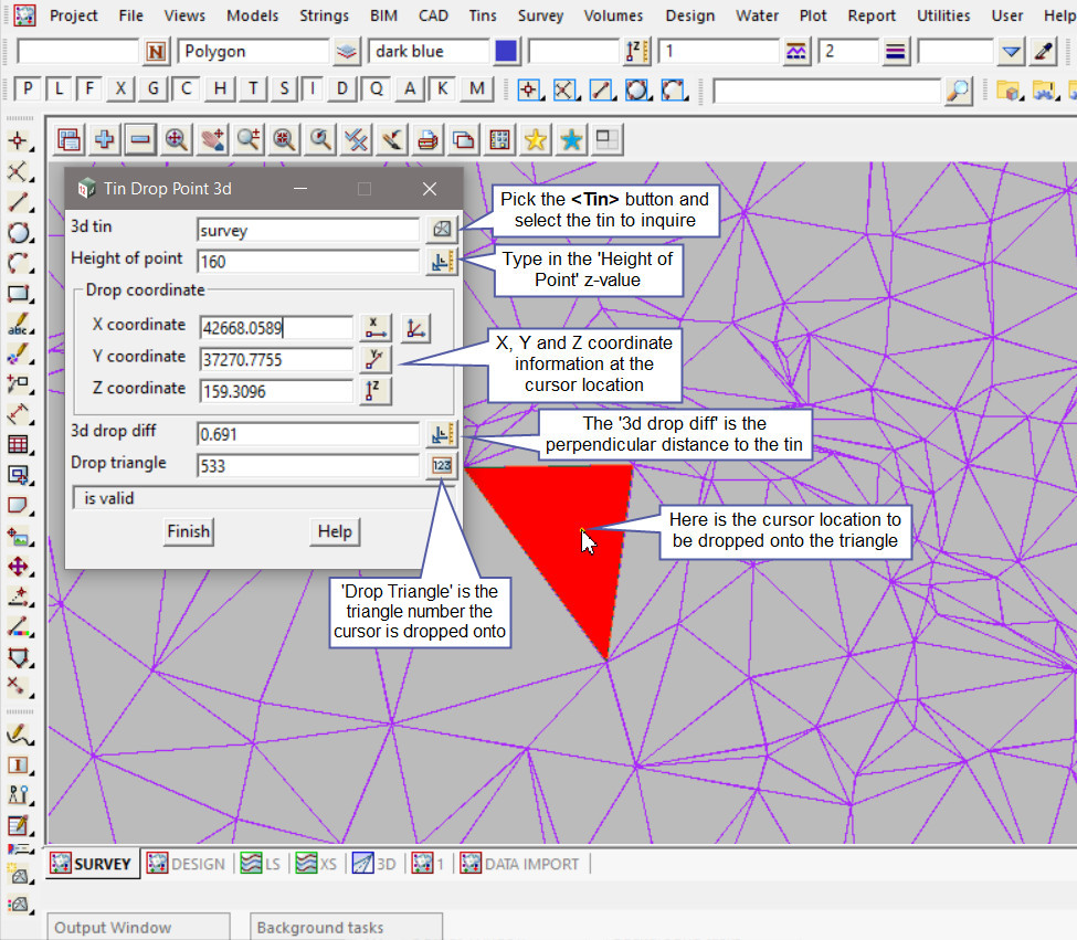 Type in a ‘Height of Point’ z-value, then move the mouse around the selected tin and see the panel displaying the cursor location X, Y and Z coordinates.