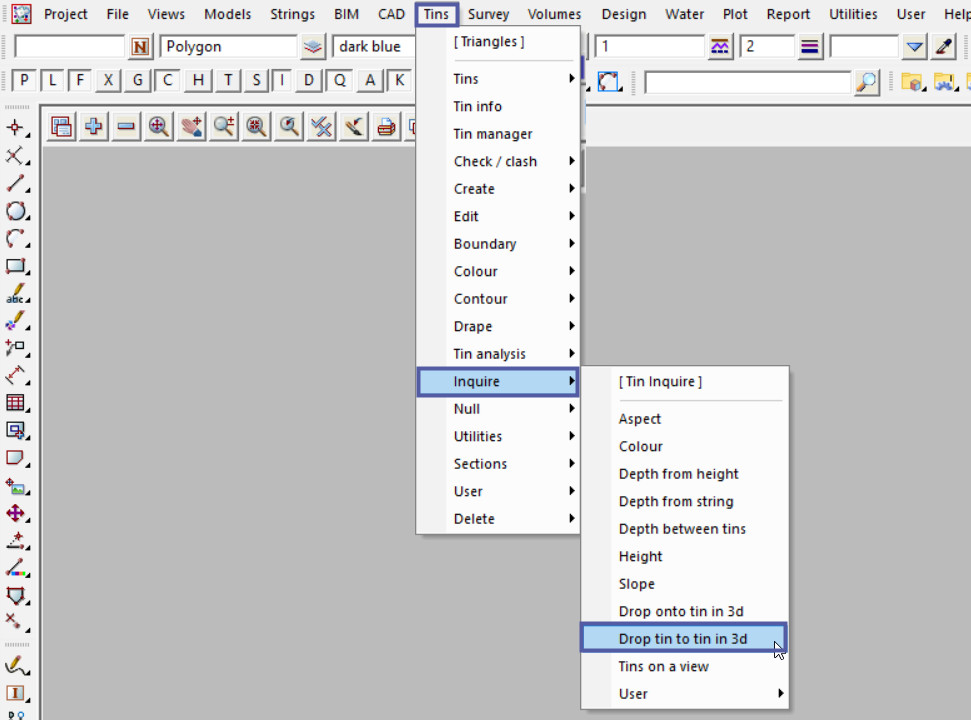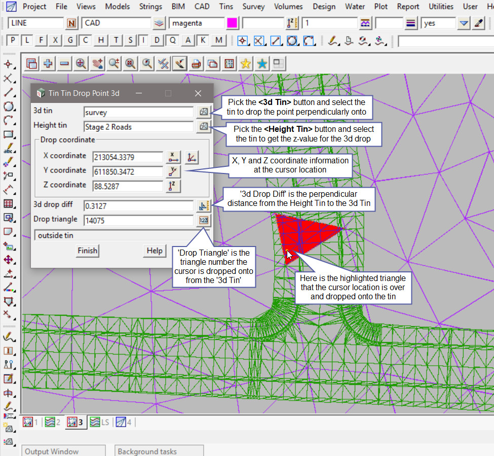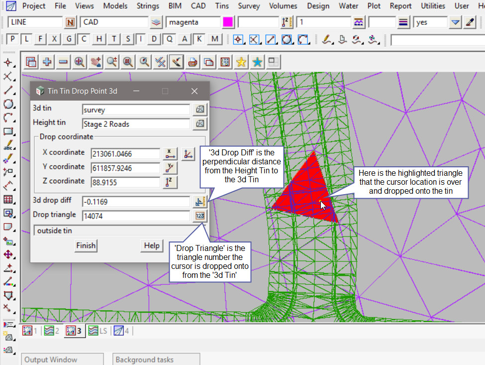 The triangle from the ‘3d Tin’ will highlight red where the cursor is positioned, and the yellow line will display the perpendicular distance line from the position on the ‘Height Tin’ to the ‘3d Tin’.