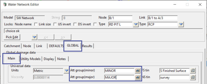 The ‘Major’ and ‘Minor’ attribute groups are set on the Global/Main tab of the Water Network Editor (WNE).
