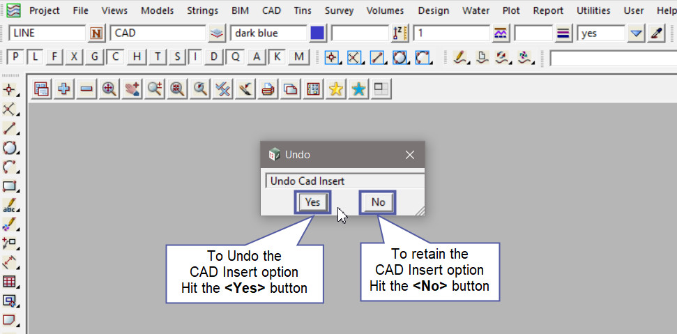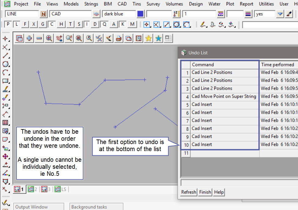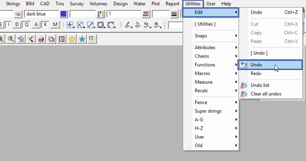 Undo and Redo are available for most of the Strings/CAD options and most of the Utilities options.