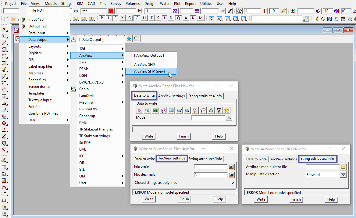 Note: Both export options require the ArcView SHP file Input/Output module for access to this feature. If your menu item provides a message saying “No license available” or is greyed out, you will need to try a different license/dongle or contact your local 12d Model distributor.