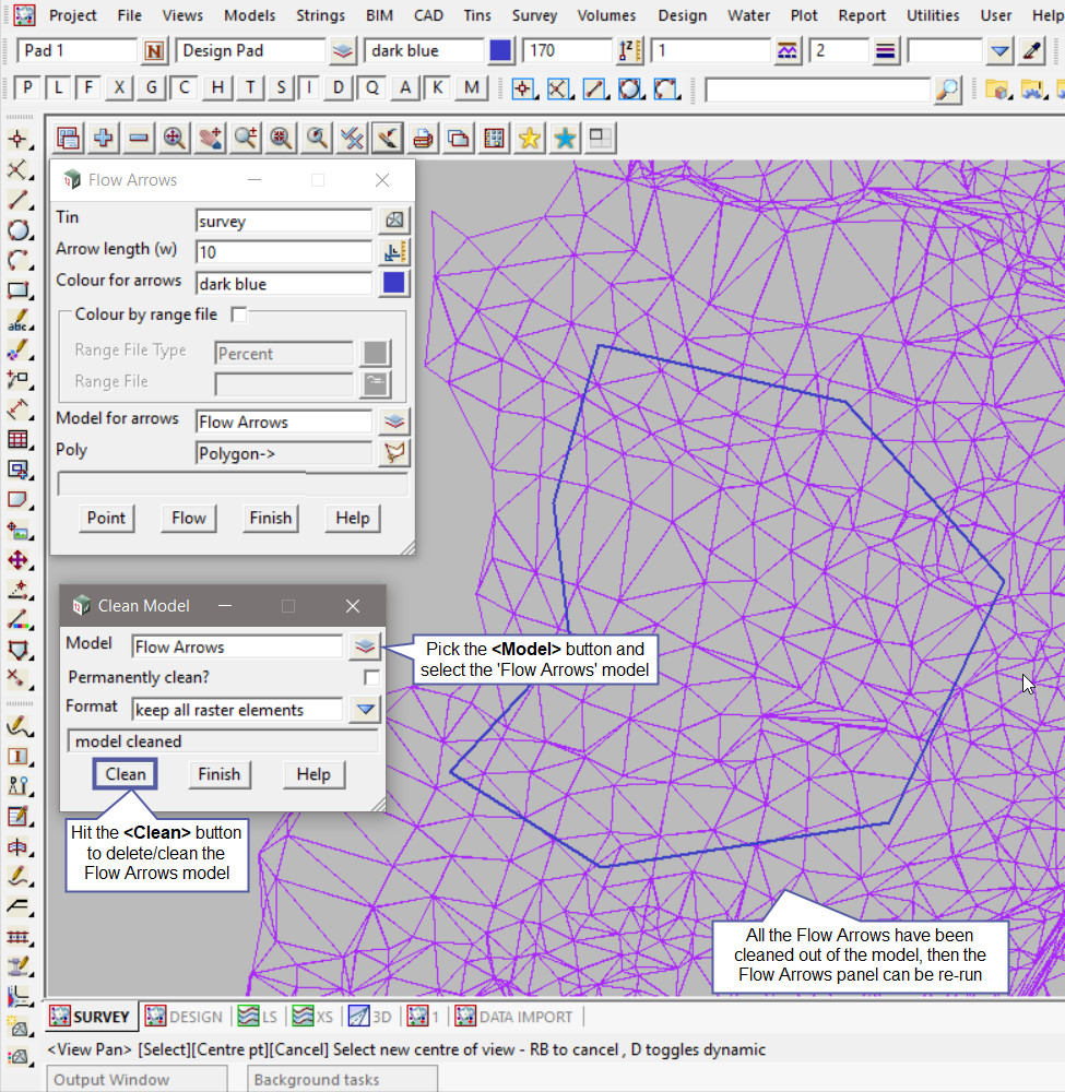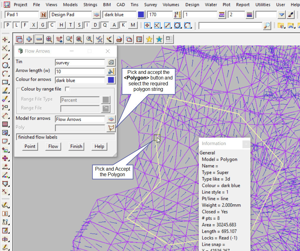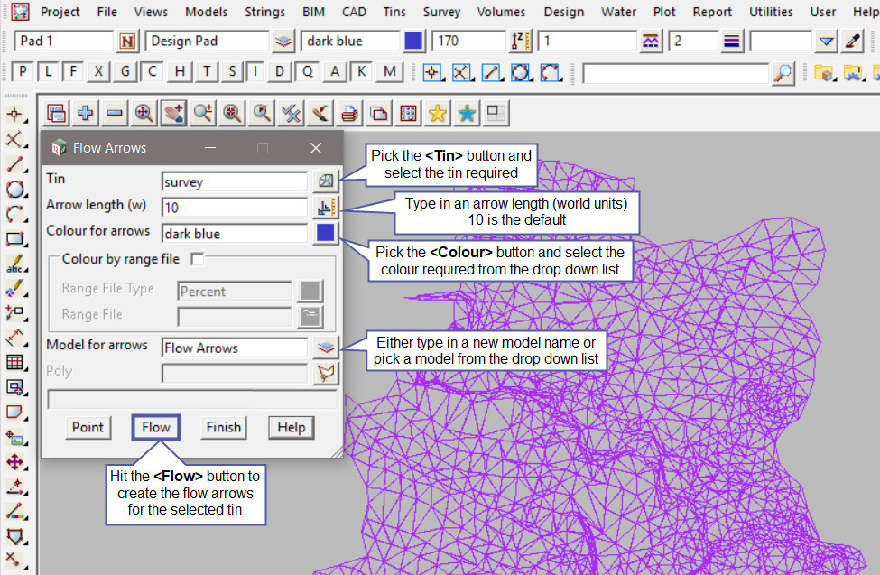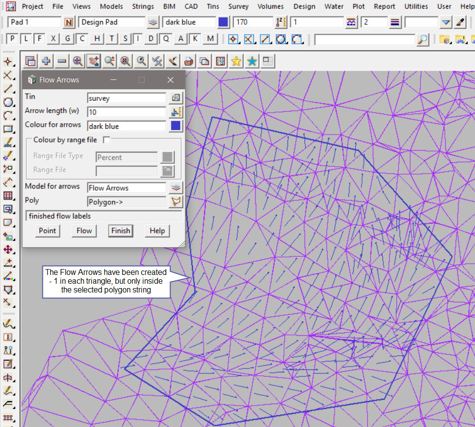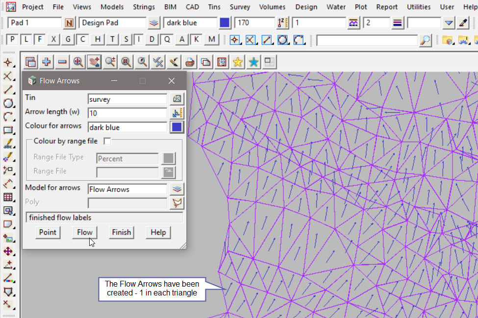 Note: If only one or a few flow arrows are required, instead of hitting the Flow button, hit the <Point> button and pick and accept inside only 1 triangle at a time.