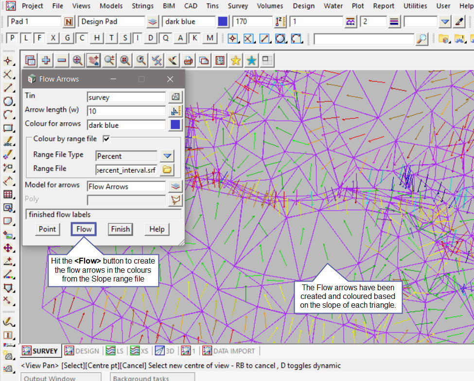 Hit the <Flow> button to create the flow arrows for the selected tin. The flow arrows will be coloured based on the colours in the Slope range file.
