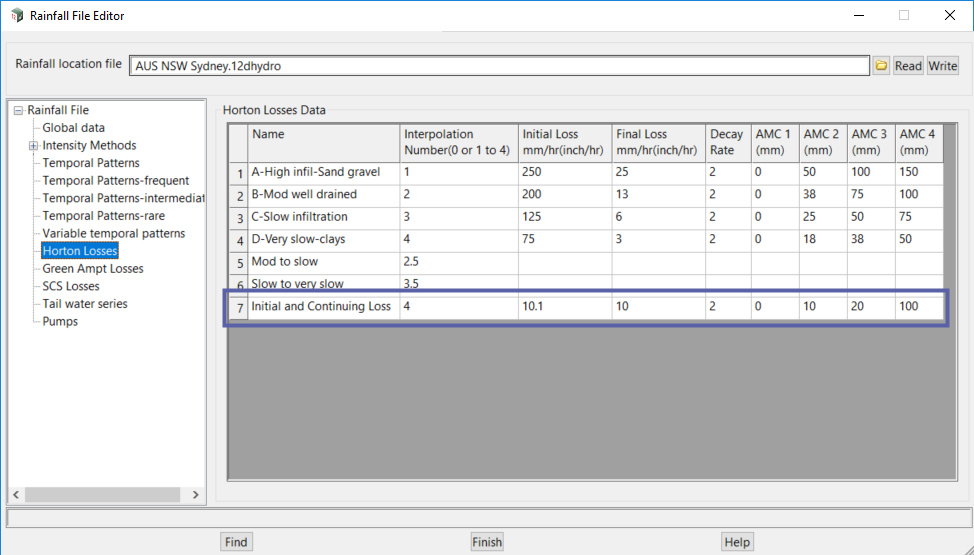 - In the Rainfall File Editor, go to the ‘Horton Losses’ section, and create a new Loss profile where the Initial and Final Loss are set to the known infiltration rate for the saturated catchment.