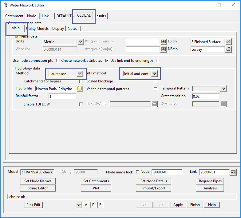 - In the Water Network Editor (WNE) goto the Global/Main tab, and set the Method to ‘Laurenson’ or ‘Time Area’, and the Infiltration Method to ‘Init-Cont’