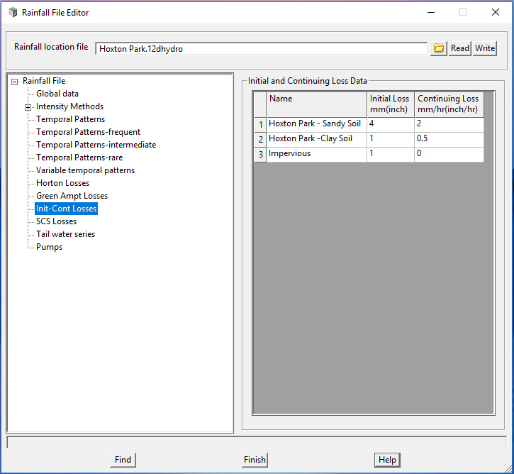 - In the Rainfall File Editor, go to the ‘Init-Cont Losses’ section, and enter the Initial and Continuing Loss for the relevant soil types in the study area.