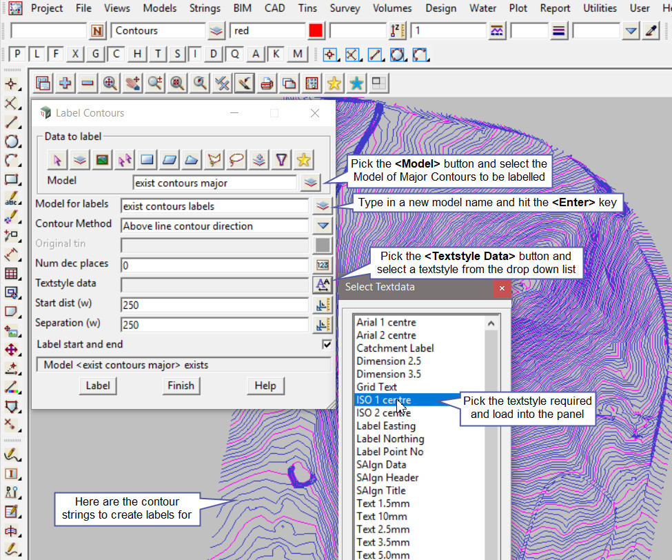 This option is used to create text labels for existing contour strings.