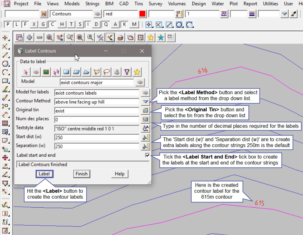The ‘Start Dist (w)’ and ‘Separation (w)’ options allows users to create extra contour labels along the contour strings. The 250 default value are 250m distances between labels.