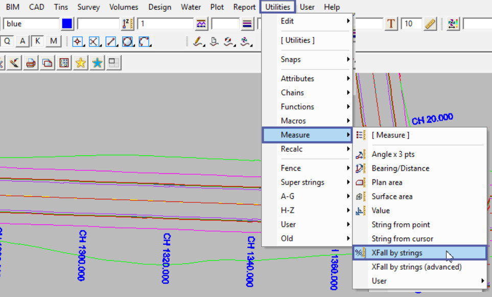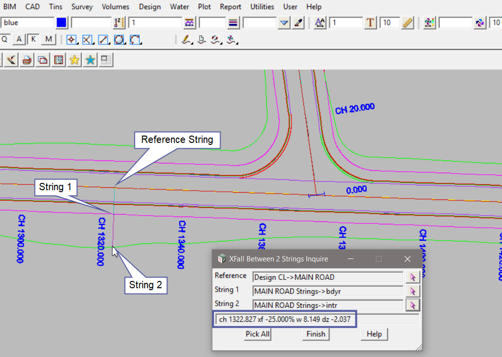 This tool is used to measure the Crossfall (Xfall) between 2 selected strings.