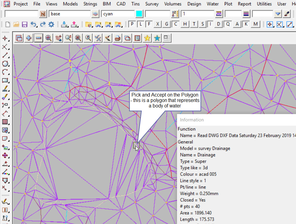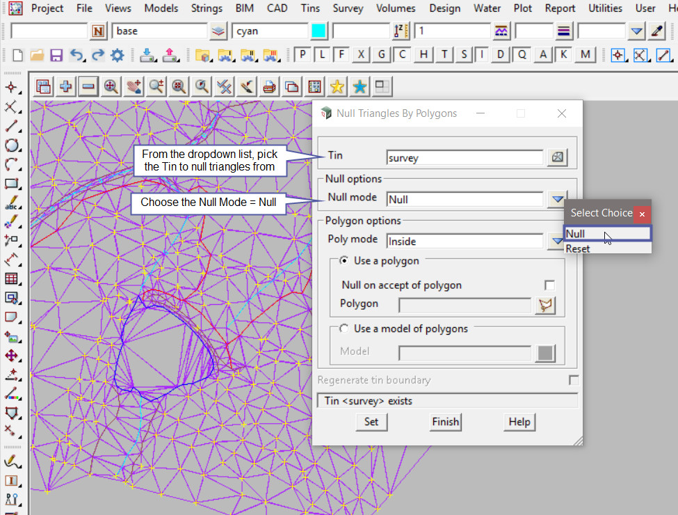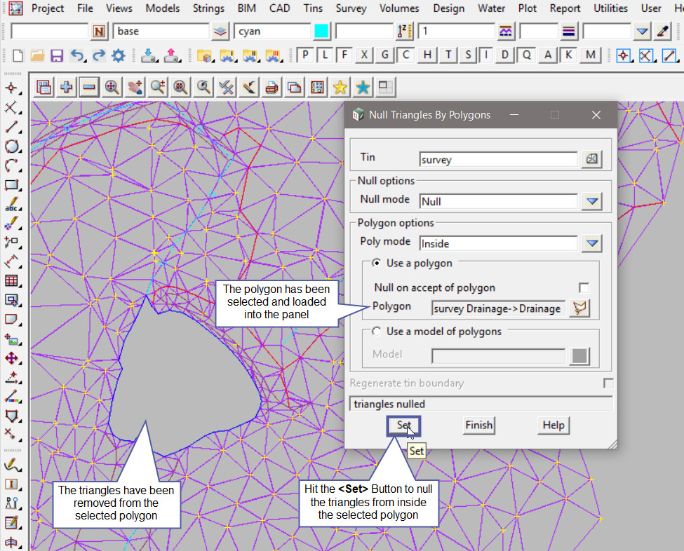 Note: To null a triangle is to remove it from the TIN, nulling does not delete the triangle/s from the TIN. 12d Model does not delete triangles. If the triangle has been nulled it can be reset (turned on) again.