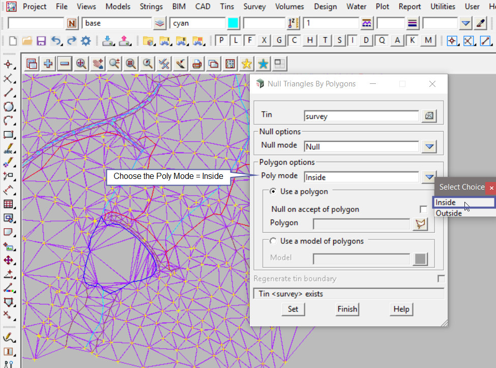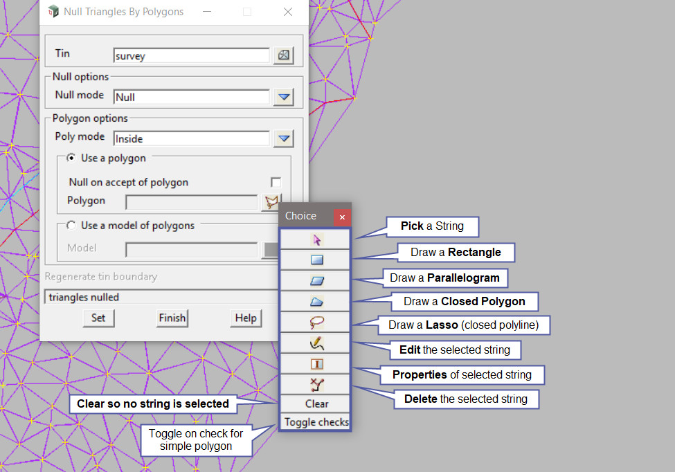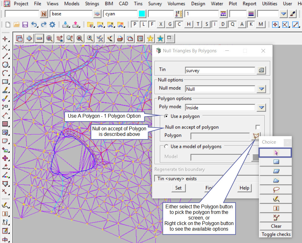 The theory for nulling a triangle by a polygon is about where the triangle centroid falls, so if the centroid of the triangle falls ‘inside’ or ‘outside’ the selected polygon (whichever option is selected on the panel) the triangle will be removed from the TIN.