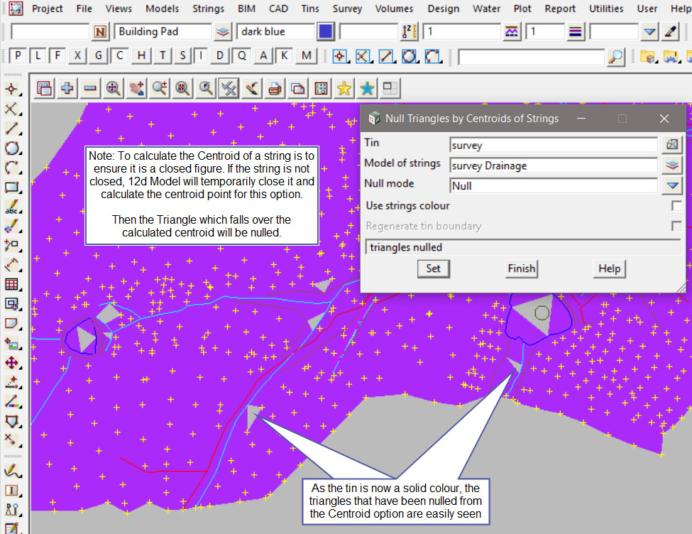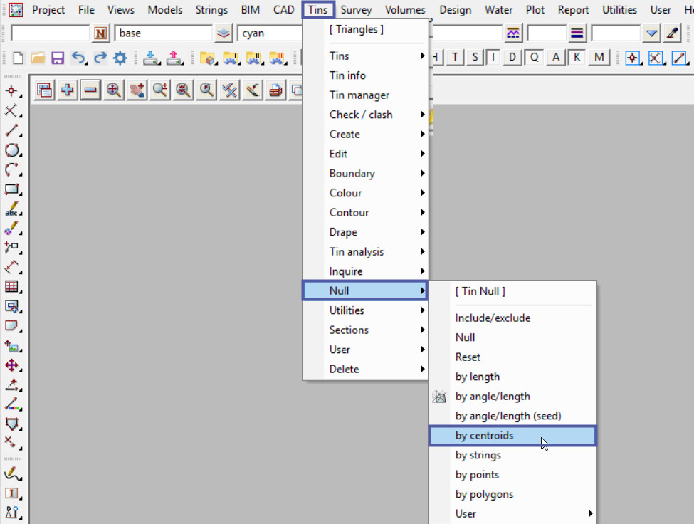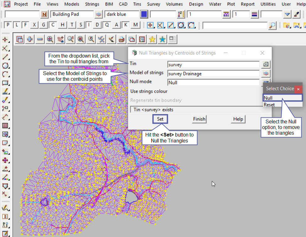 This option is used to Null (remove) Triangles from a TIN by selecting a model of strings and using their centroid.