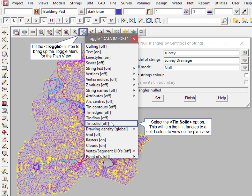 It is hard to define when one triangle has been nulled (removed) from inside a Tin, an easy way to show this on the plan view is to use the Tin Toggle options.
