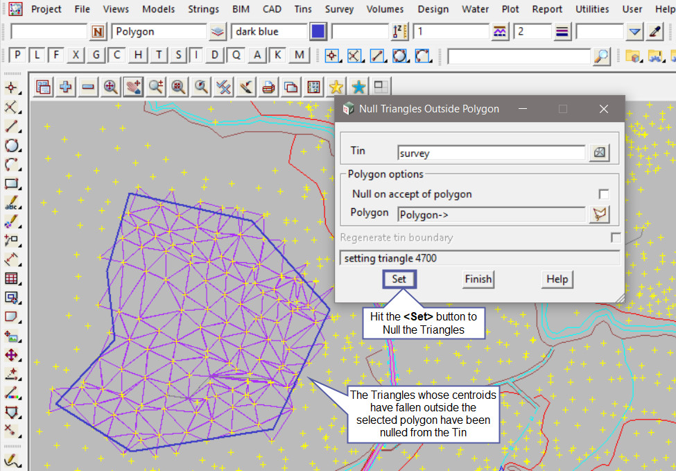 Hit the <Set> Button to null the triangles outside of the selected polygon (the Triangles whose centroid is outside of the polygon).