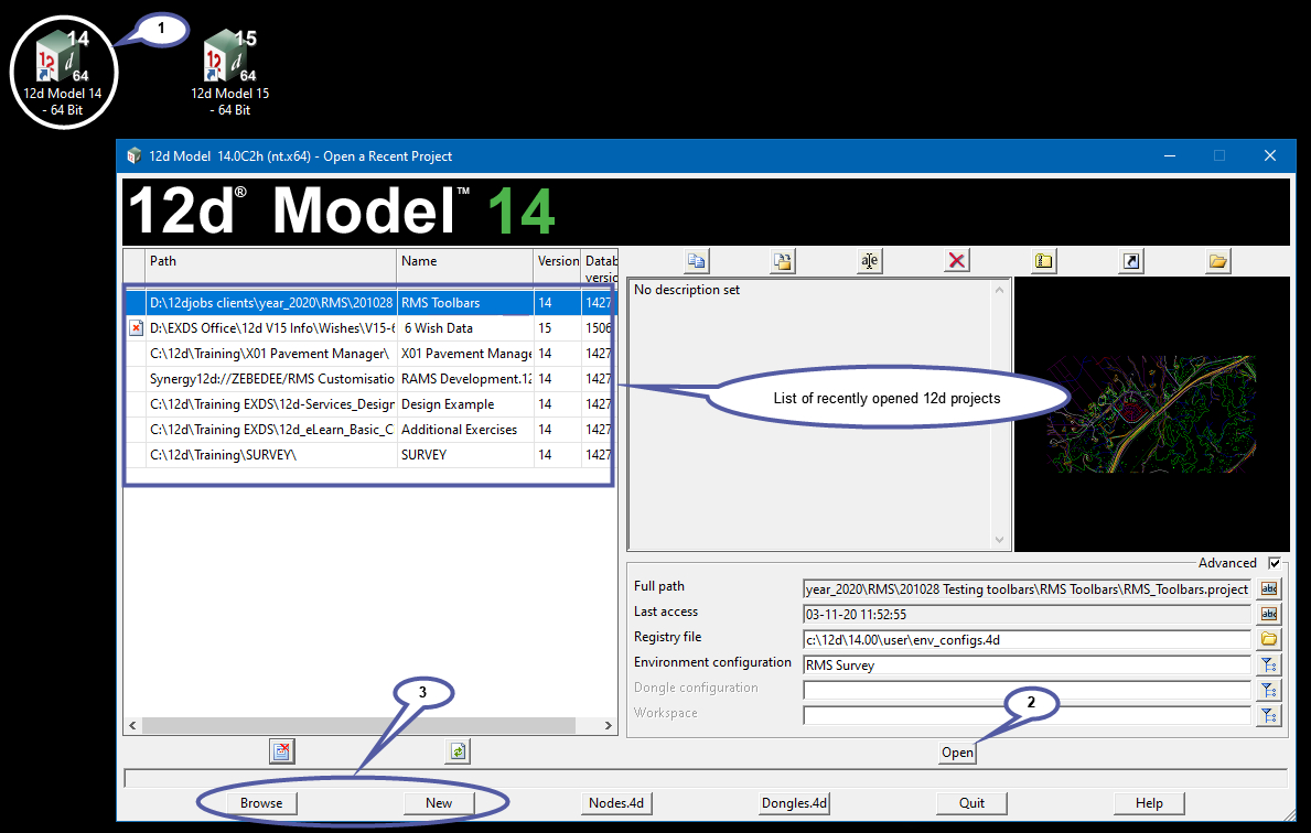 - Simply double click on the 12d Model desk top icon (as shown below) and view the list of recently opened projects.