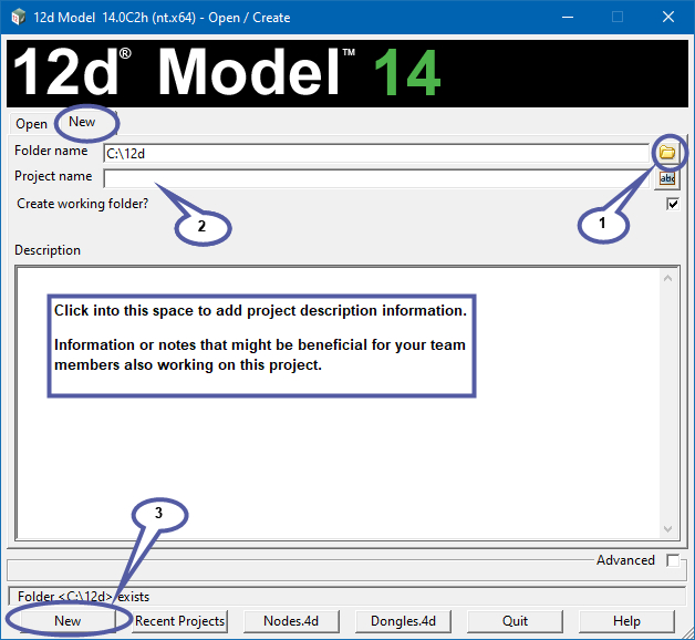 Note: It is encouraged to provide some notes in the project description area to help others better understand the purpose and contents of the 12d project. This information can be seen in the “Recent projects” panel, via sharing of 12d Project data and so can be viewed without the need to open the 12d Project to view its contents.