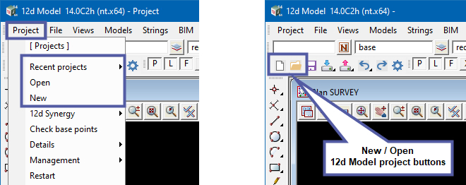 If you are Currently within a 12d Model Project. You can also view your “Recent Projects”, “Open” existing projects or create “New” projects via the main menu or toolbar buttons as shown below.