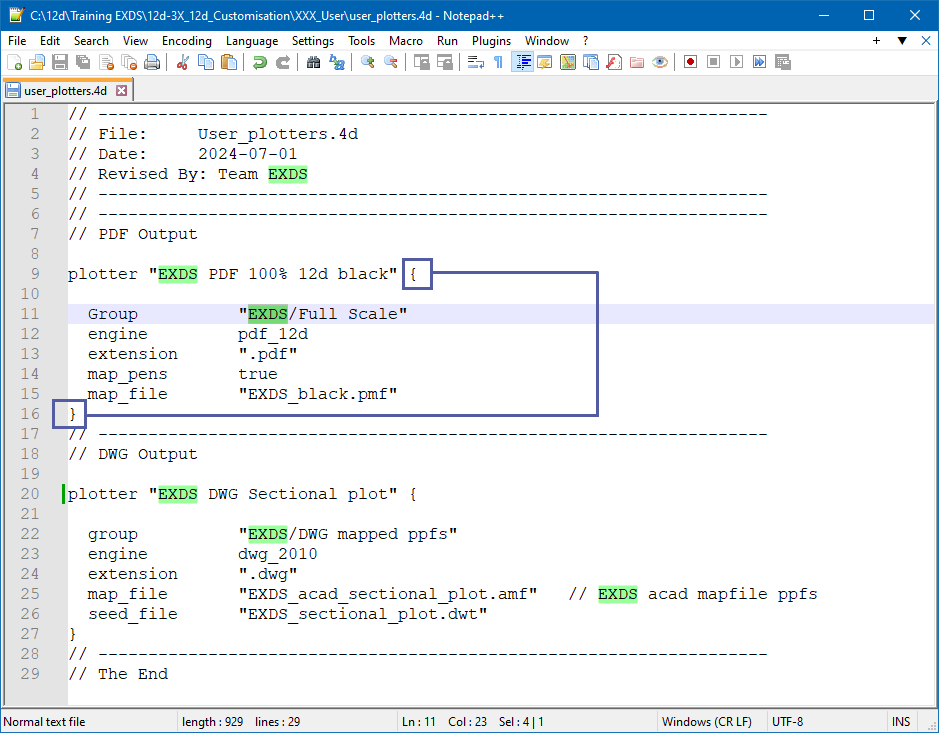 Like many of the other (*.4d) text files provided by 12d, the plotters.4d file provided contains a “#silent_include” option and this will help automatically add your text file “User_plotters.4d“.  It is in this user definable file where additional functionality should be added for your company and provides the most flexibility as the shipped examples from 12d are likely to change with additional enhancements over time.