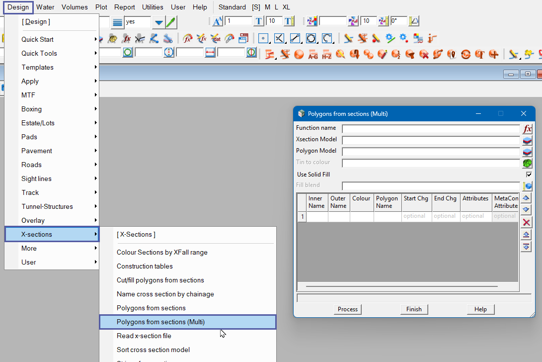 Use: Design => X-Sections => Polygons from Sections (Multi)