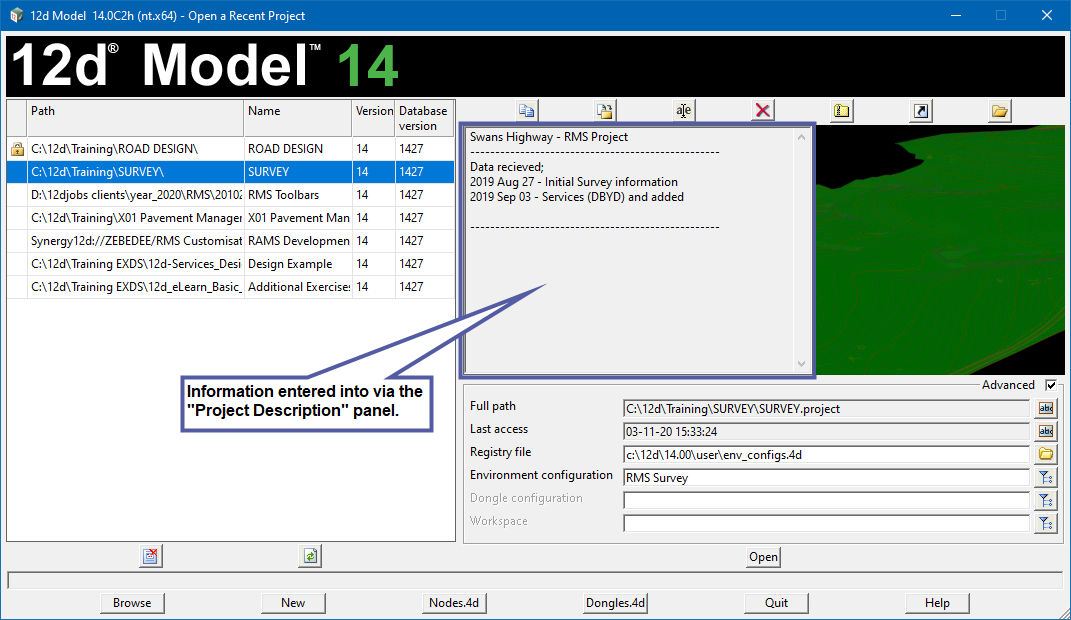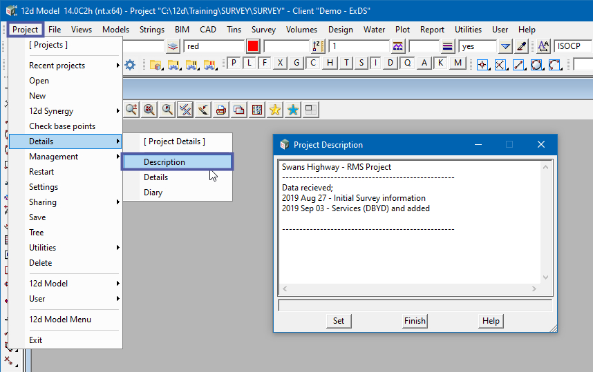 The project “Description” panel is provided for Users to leave a note or message to other 12d Model Users.