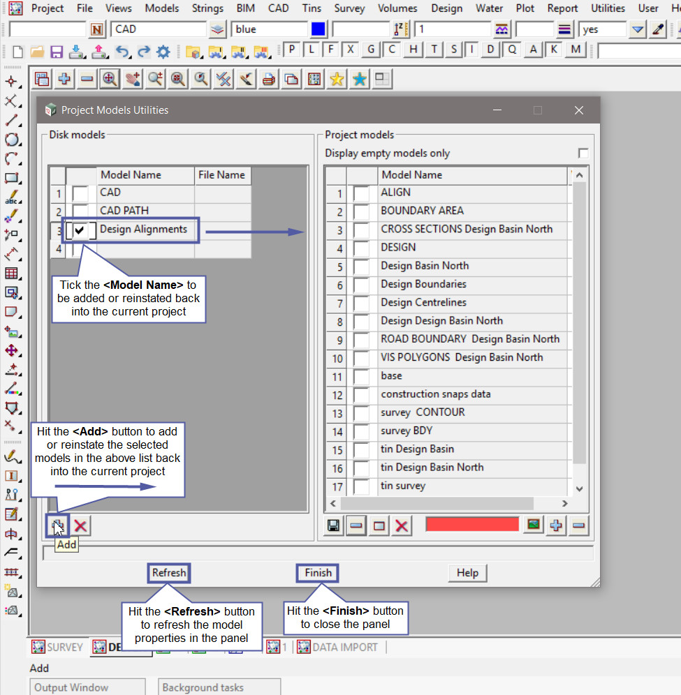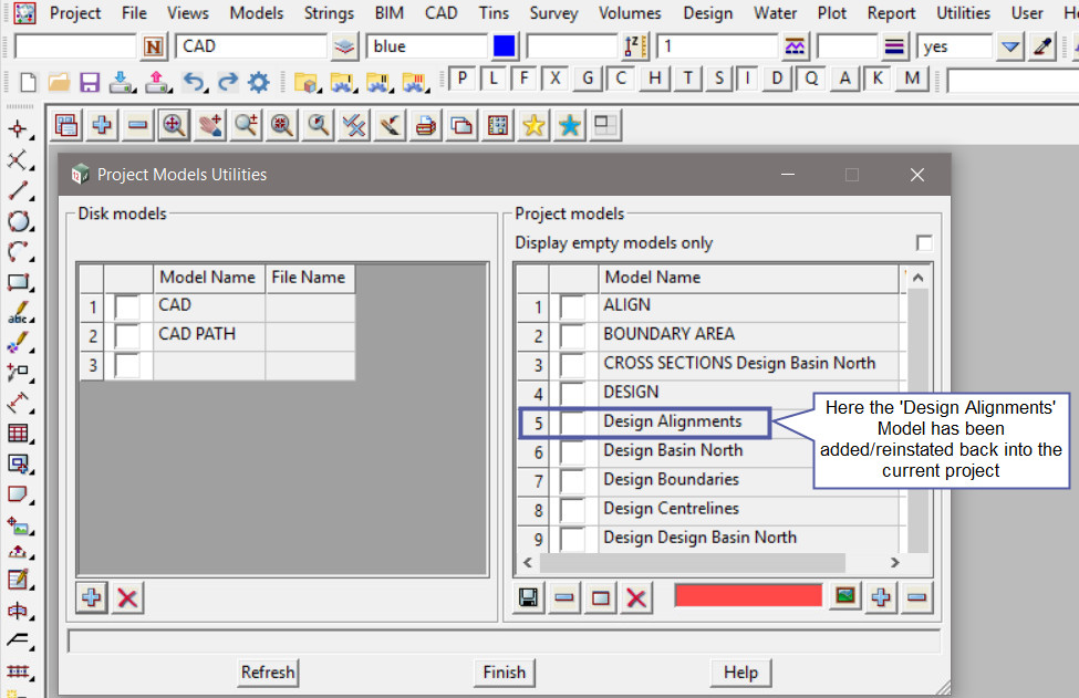 The image below shows that the ‘Design Alignments’ Model has been added/reinstated back into the current project.