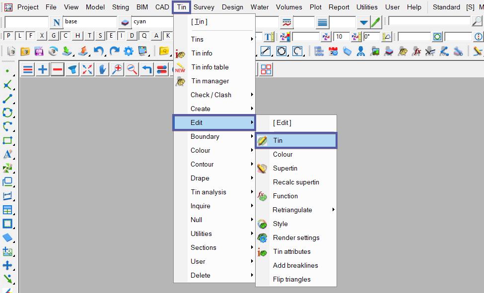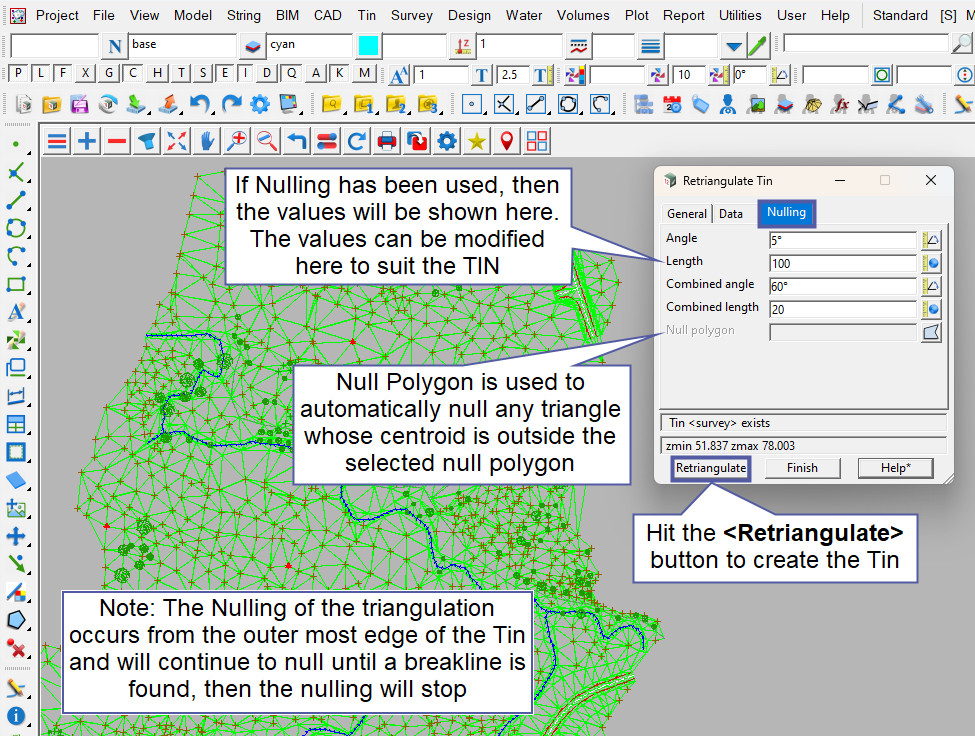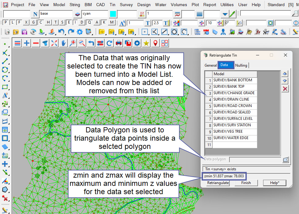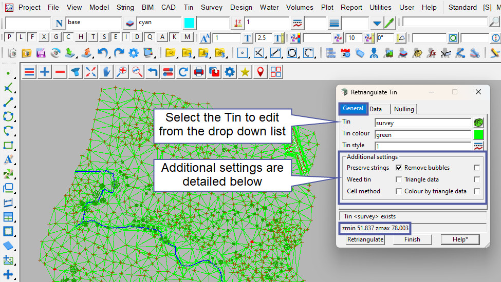 When a TIN has been created, it can be edited at any time by utilitising the Retriangulate TIN panel, all the options from when the Tin was created are available here.