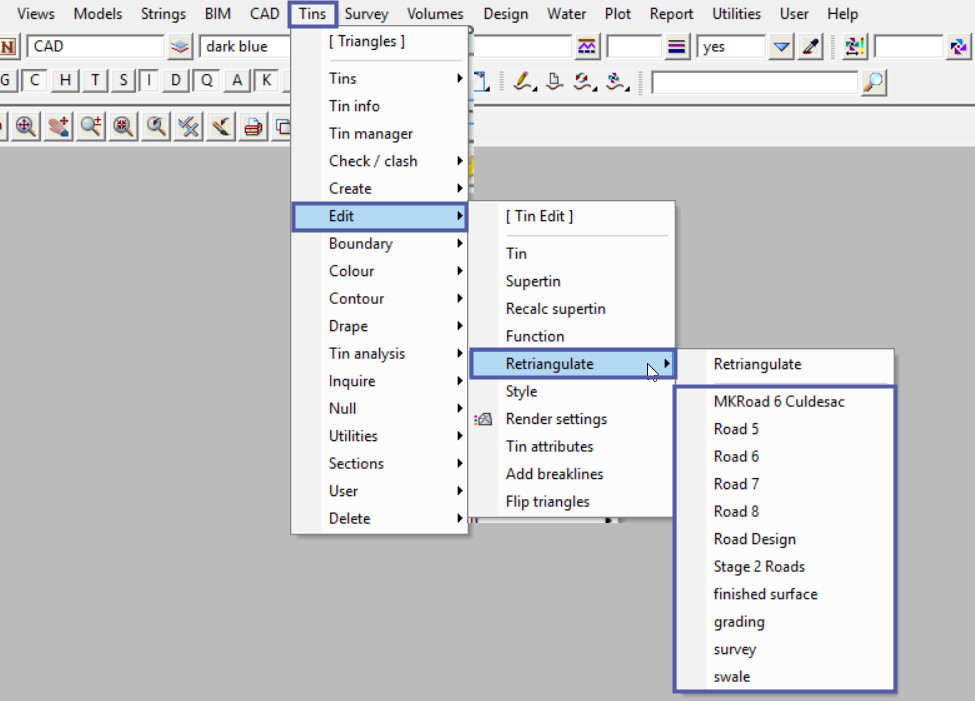 A list of all the Tins in the project are shown and if one is selected, it will be retriangulated without having to open a panel. This is great if no settings for the Tin need to be amended.