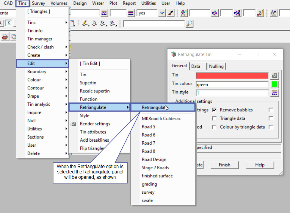 When the ‘Retriangulate’ option at the top of the menu is selected, the Retriangulate Tin panel is opened as shown below.