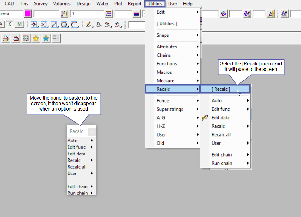 Then move the panel on the screen, this will paste it to the screen and remain on the screen when options are used. The Recalc panel is also opened and available when a new project is created – so don’t just close it, use it!