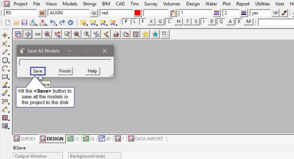 Note: Models are automatically saved on the disk when they are first created, but various operations can then change the data in the models which may not be immediately updated on the disk. This option the ensures that the models will be saved to the disk, ie server location, or local disk ie C: drive. It is like exiting and saving the whole project back to the disk, but this panel will save all the models in the project to the disk location.