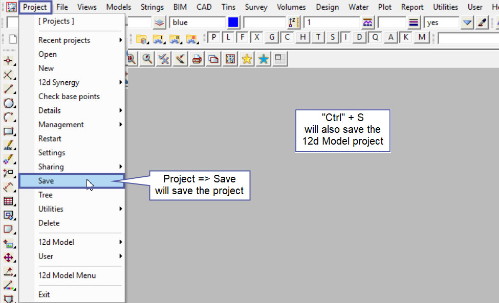 The second way to save a 12d Model Project is to hold the “Ctrl” key down and click “S” on the keyboard. (Just like any windows program)