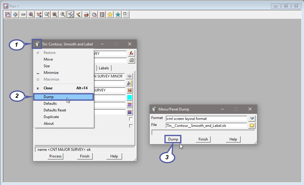 To save a SLX file, LMB (left mouse button), on the small 12d icon at the top left of the panel you wish to save. Under the “Dump” command, a smaller panel appears and the user is able to save the file in various formats including a SLF.