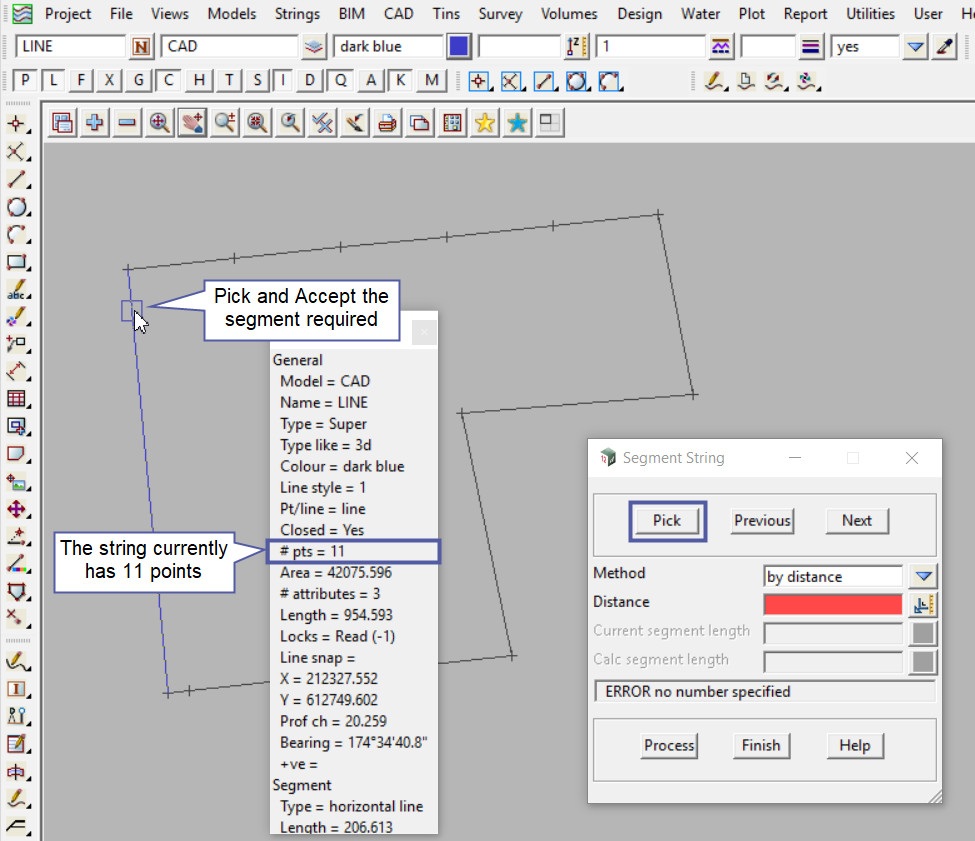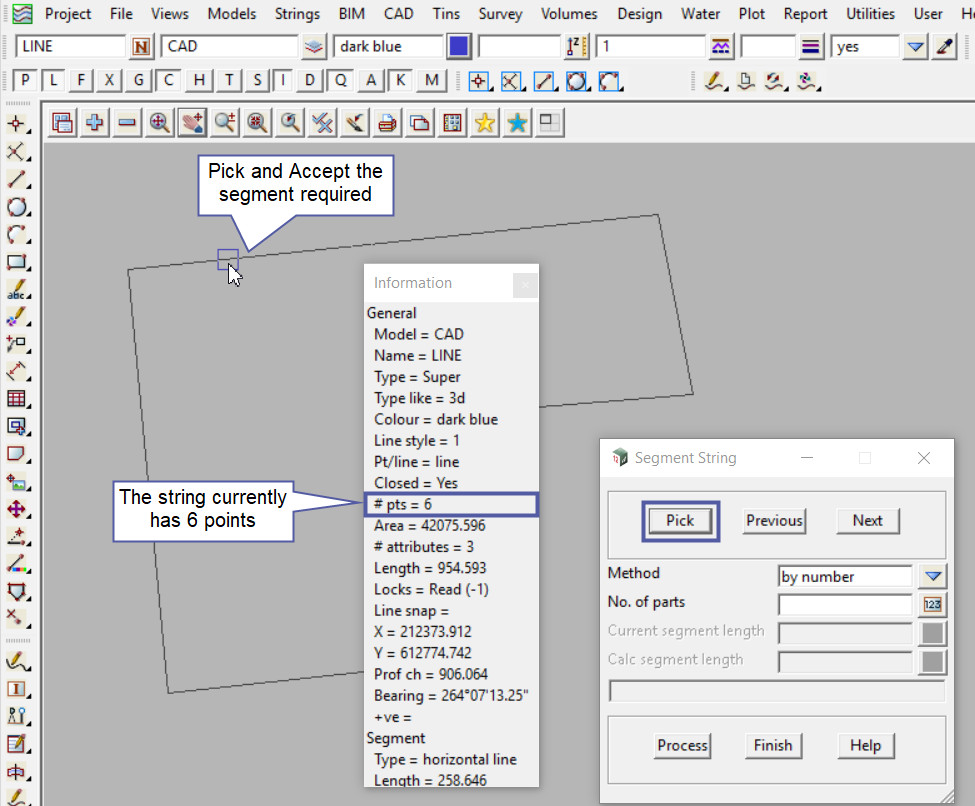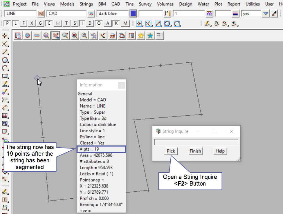 Using a String Inquire the string can be checked to see that all the segmented points have been created in the string, as it now has 19 points, from the original 6 points.