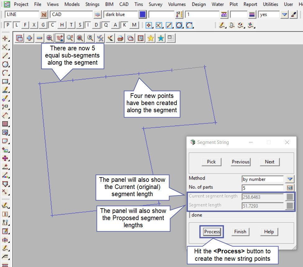 Type in the No. of Parts and hit the <Enter> key, 12d Model will fill out the Current Segment Length and the Segment Length fields.