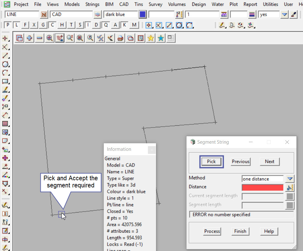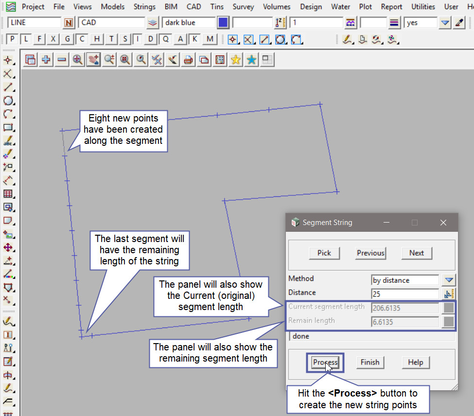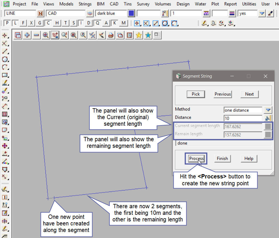 Type in the Distance and hit the <Enter> key, 12d Model will fill out the Current Segment Length and the Remain Length fields.