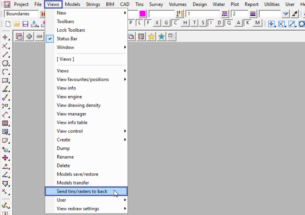 Run the ‘Send Tins/Rasters to Back’ option and 12d will send any Tin and Raster Models to the back of the view by moving them in the drawing order/list for each views in the project.