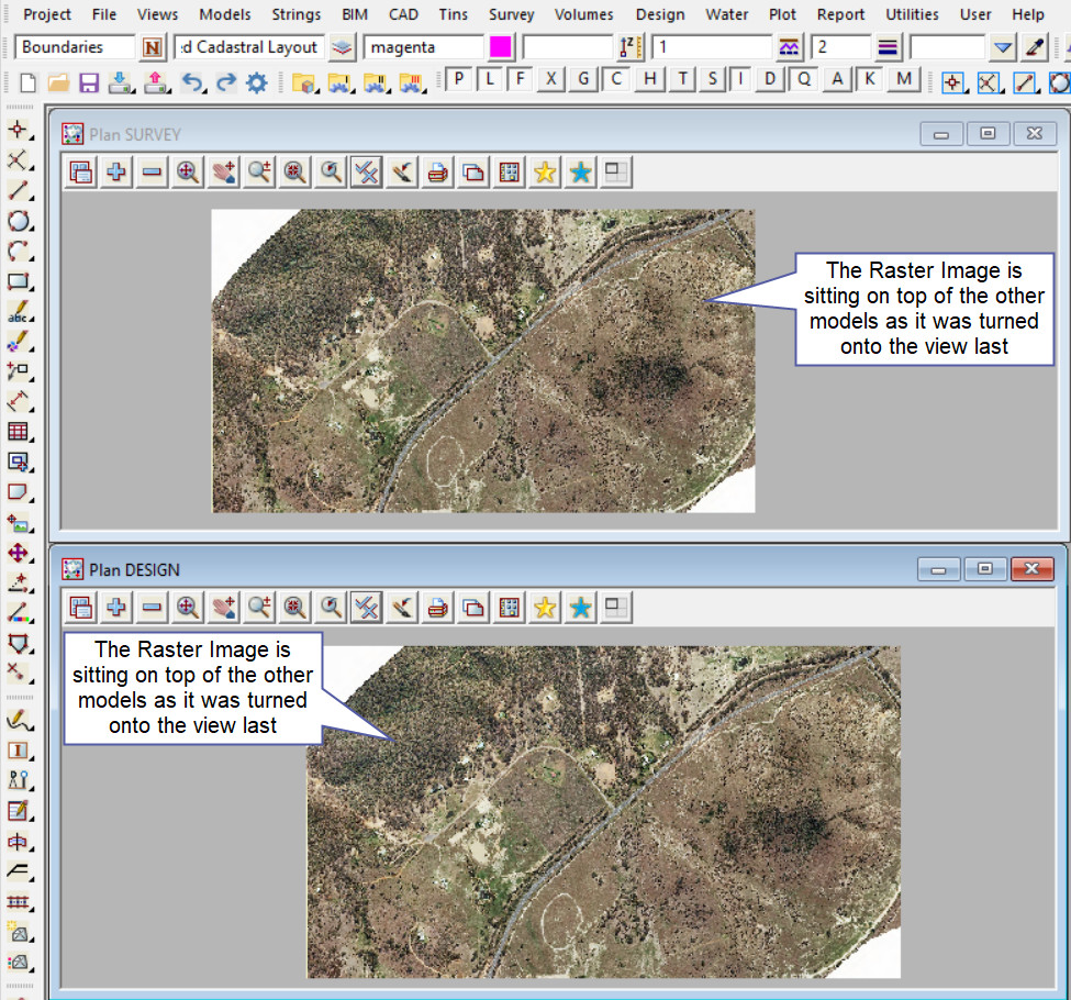 Here are two views in a project that have had the Raster Image added, and the Survey view has had the survey tin added before the raster image. The Raster Image model was the last to be added to the view, therefore it is now sitting on top of the other models in the two views.