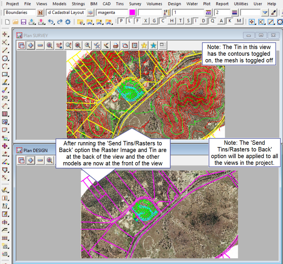 A single command can be used to send all tin and all raster images to the ‘back’ on all views – so that you can see your design with the tin or the aerial in the background.