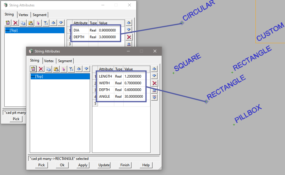 For square pits, the same attribute can be used for the Length and Width values.
