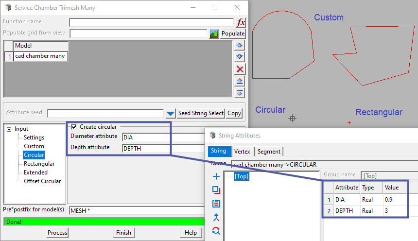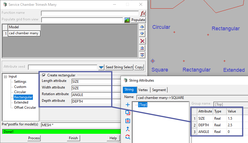 With just a Model of points/polygons, and attributes to define the dimensions (width, depth, rotation), multiple chambers can be quickly created. Points and polygons defining different pit types can be in the same Model. The type of chamber created will be determined by the relevant attributes.