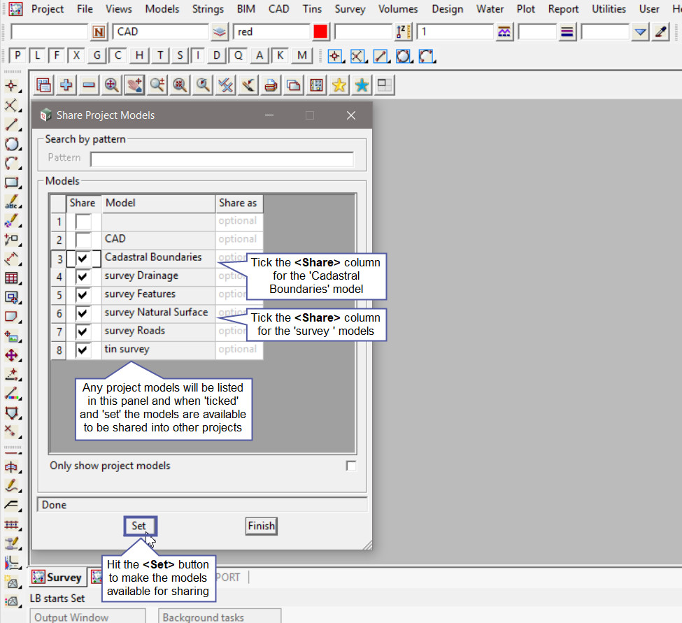 Hit the <Set> button to make all the selected models available for sharing out of the project.
