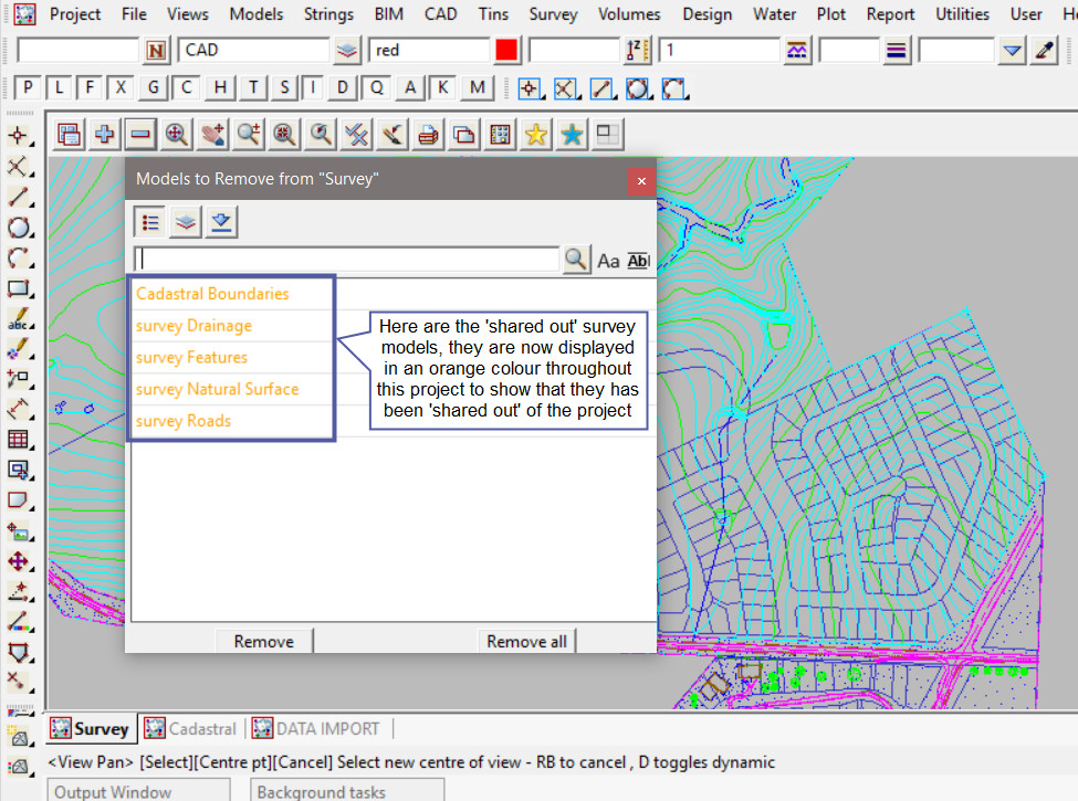 As shown below the ‘survey ’ models will now be displayed as ‘orange’ in colour throughout this project to tell the user/s that they have been shared out of the project.