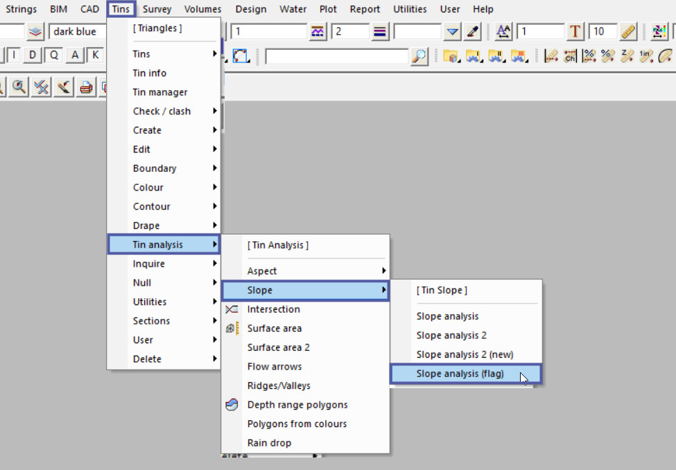 This option is used to display and report on the slope of triangles in a tin that fall within the supplied slope range file.