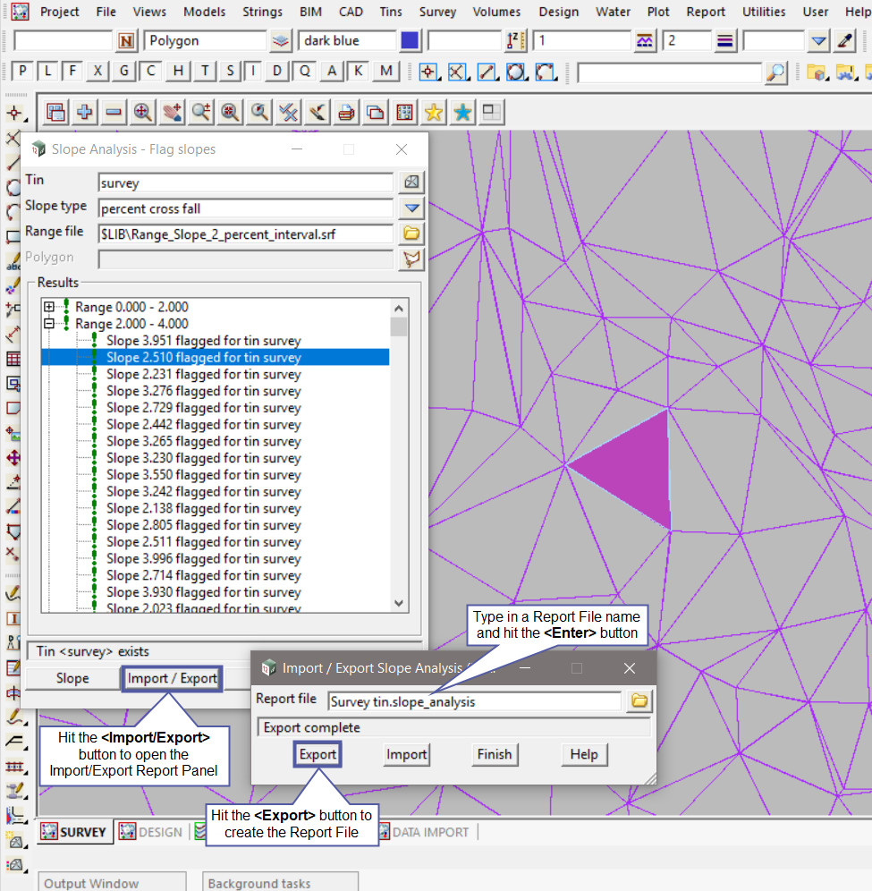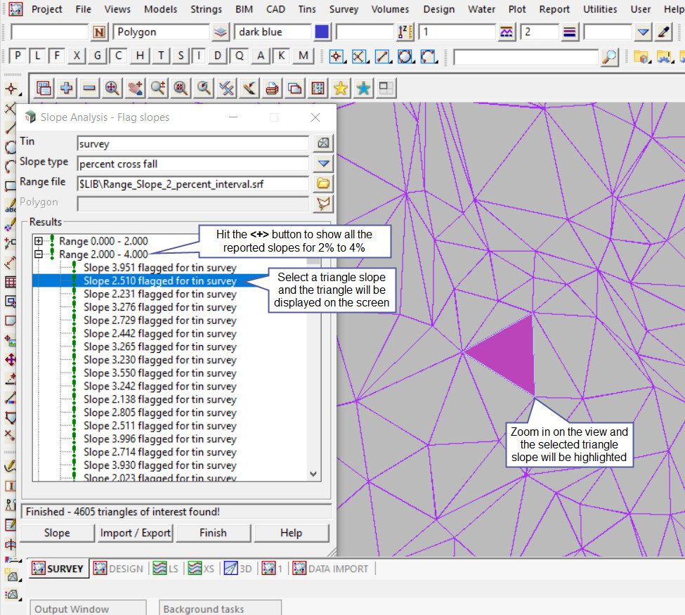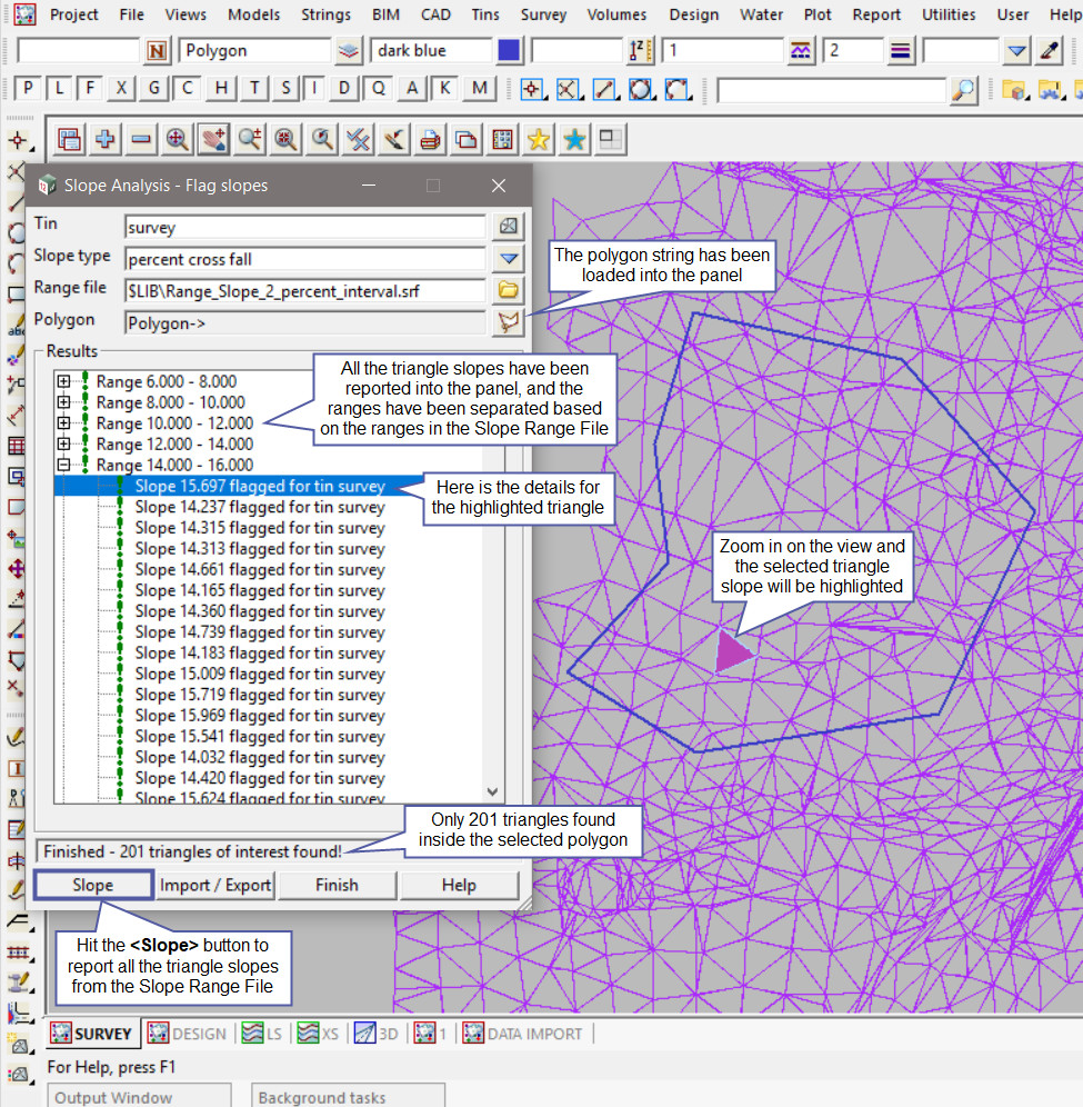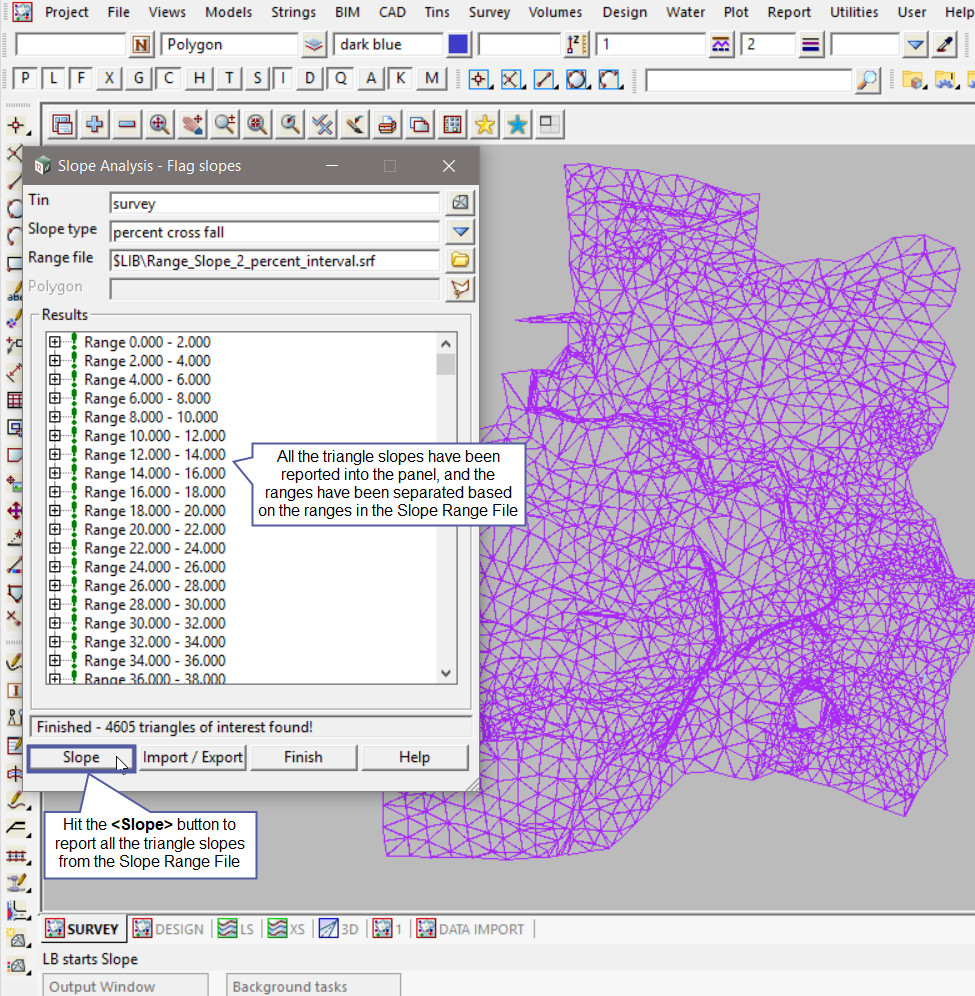 Hit the <Slope> button and the panel reports all the triangles and their slopes. The panel also separates the slope ranges into sections that are based from the slope range file.