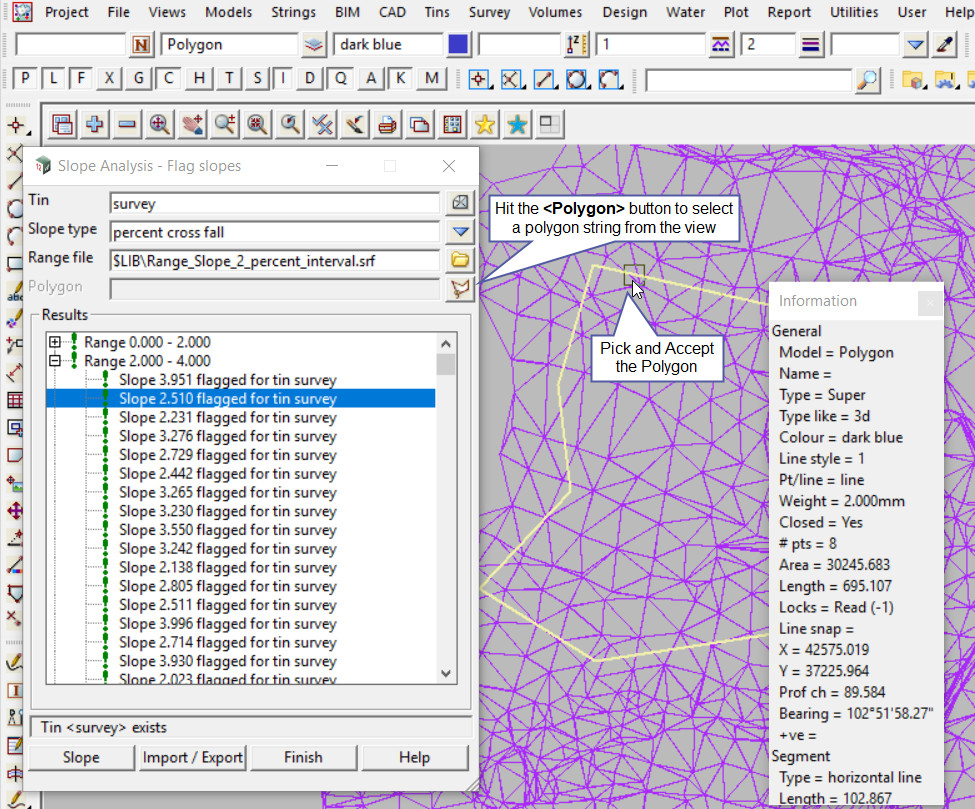 To report the slope analysis within a polygon, hit the <Polygon> button and pick and accept the required polygon string from the view.