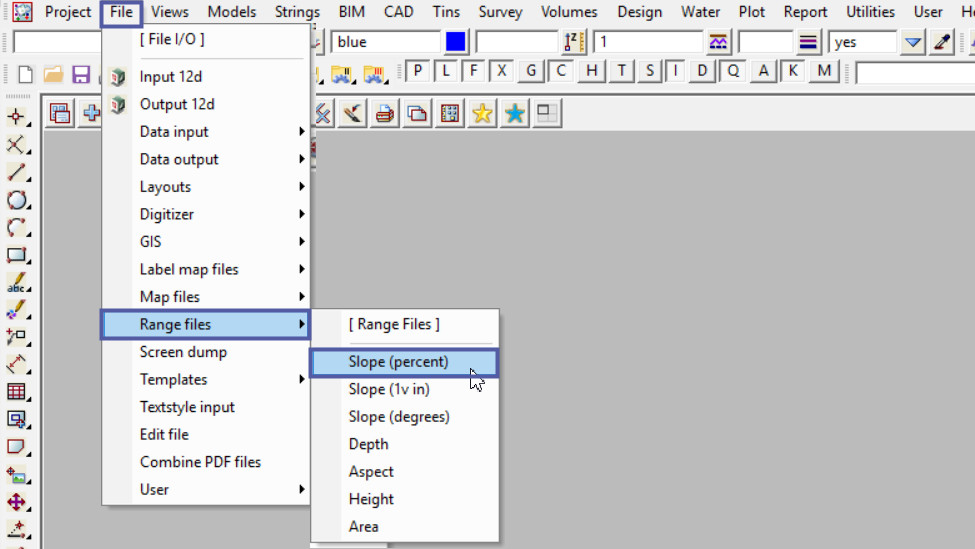 To view the Percentage Slope Range File Panel, Use: File => Range Files => Slope (percent)