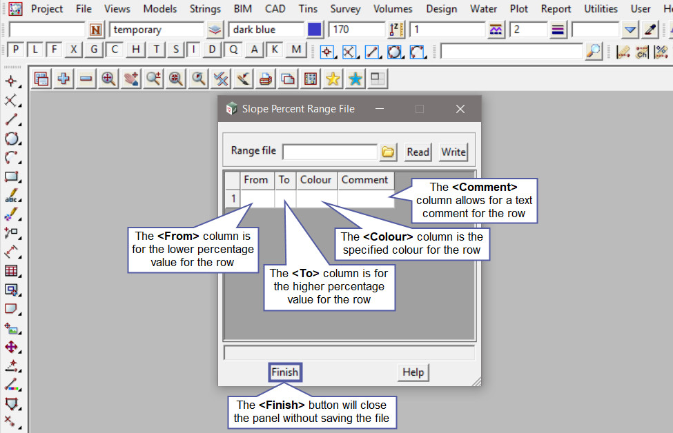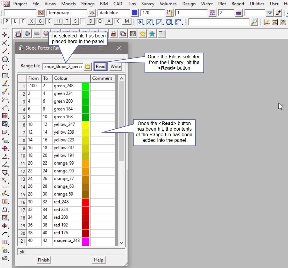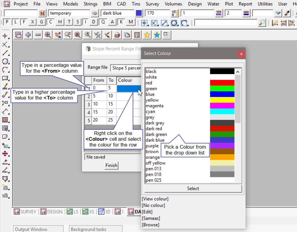 To pick a colour for each percentage slope band, right click on the colour cell and select the colour required. If you have a lot of colours/rows to select, there are tools and options available to populate and fill out the Range File panel,