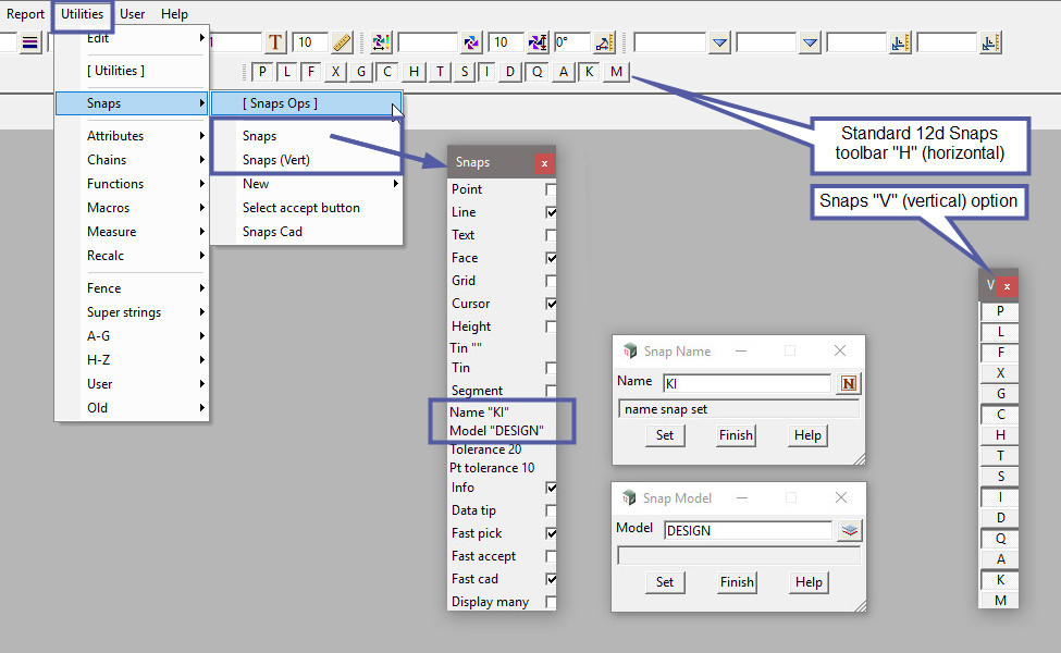 If you have tried to String Inquire (F2) on some 12d Model data and has not been selecting correctly. Or you might be utilizing some of the CAD tools and finding the snaps set are not provided you with the correct Information (options to select your vertex (point) or string) etc. You might have earlier inadvertently set a specific Snaps menu.