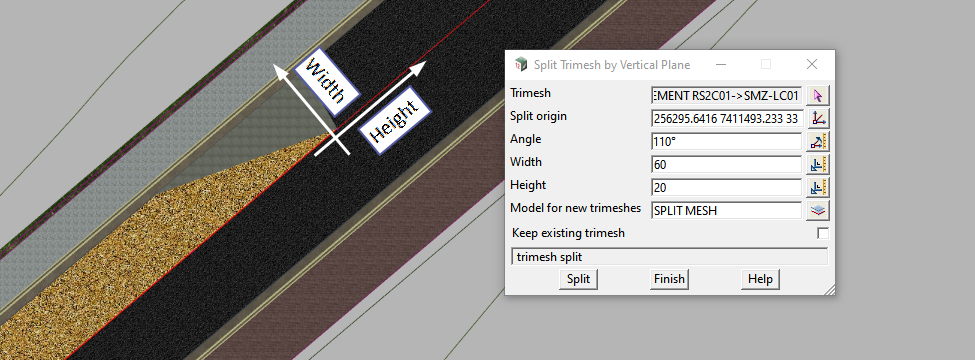 The width and height define a bounding box to test the trimesh split. If the split does not fit inside the box, the split will fail. This is useful where a trimesh may curve back towards itself (such as along a road) to avoid the trimesh being split twice. Both width and height are measured with the origin being the center of the bounding box.